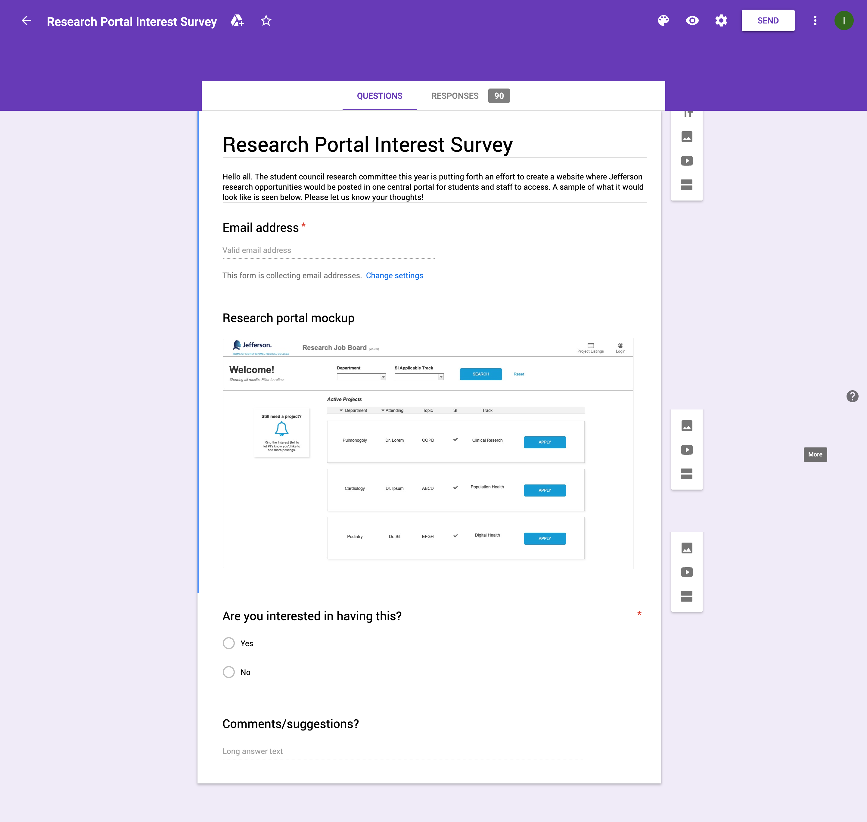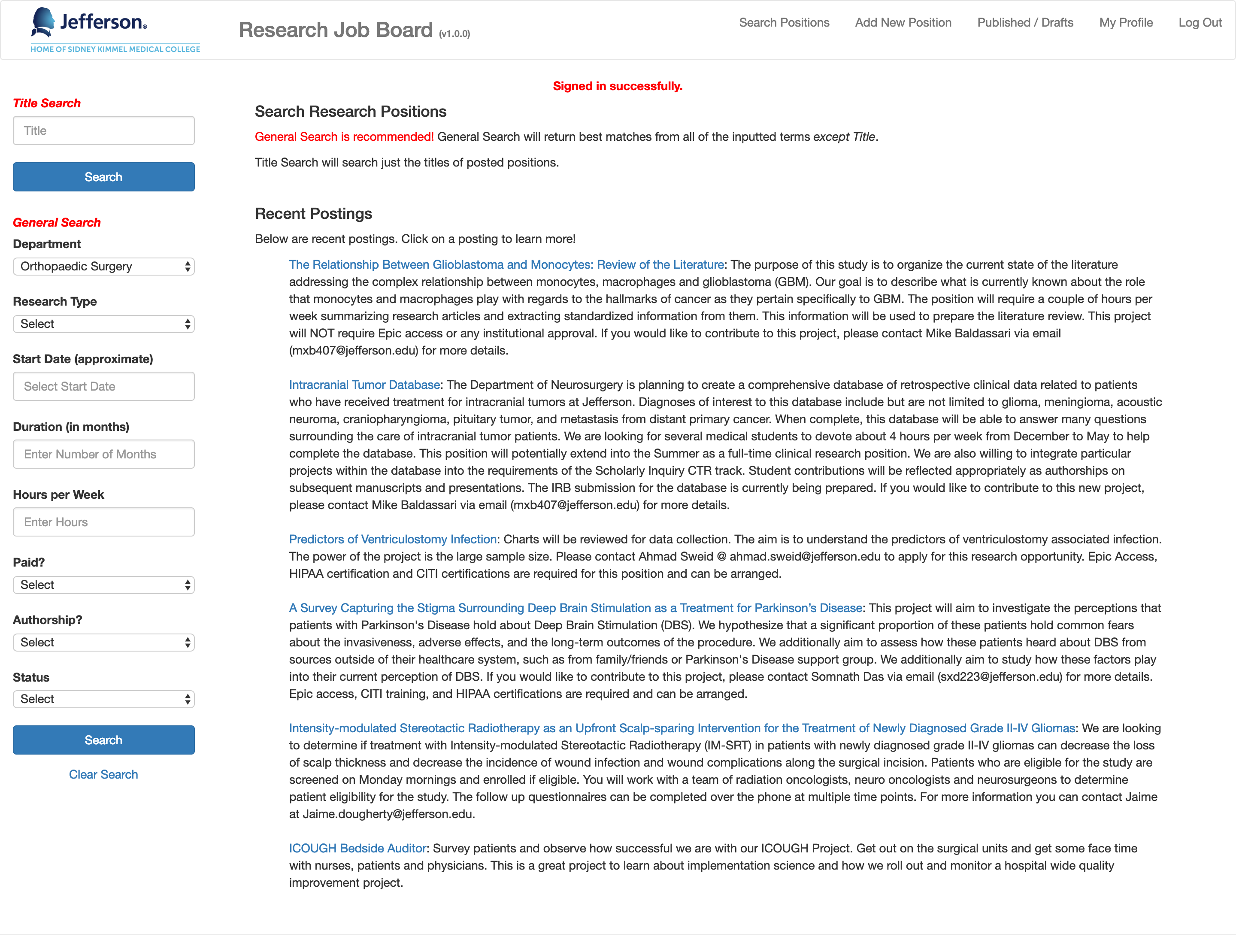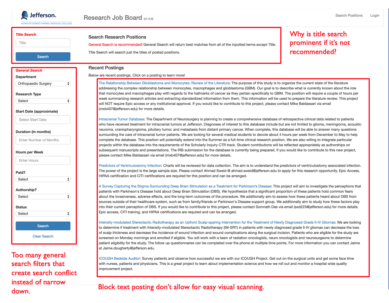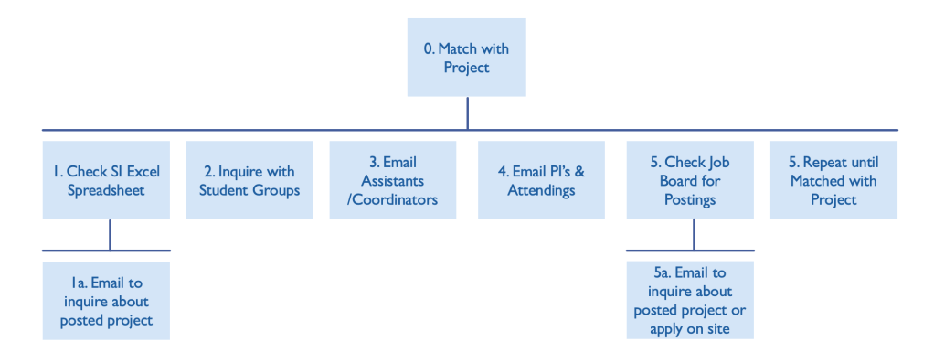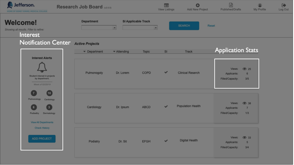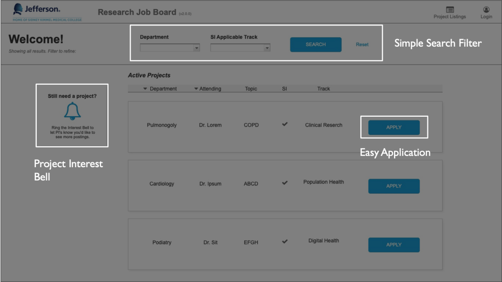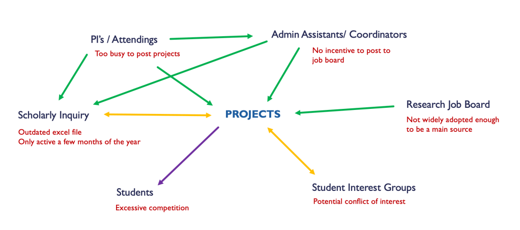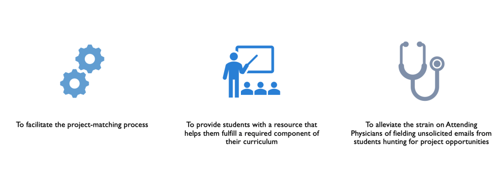 Medical students are responsible for completing the research requirement in order to proceed through the JeffMD curriculum. However, research project demand seems to currently exceed supply. Additionally, PI’s/Attendings don’t keep up with posting their projects to any database.