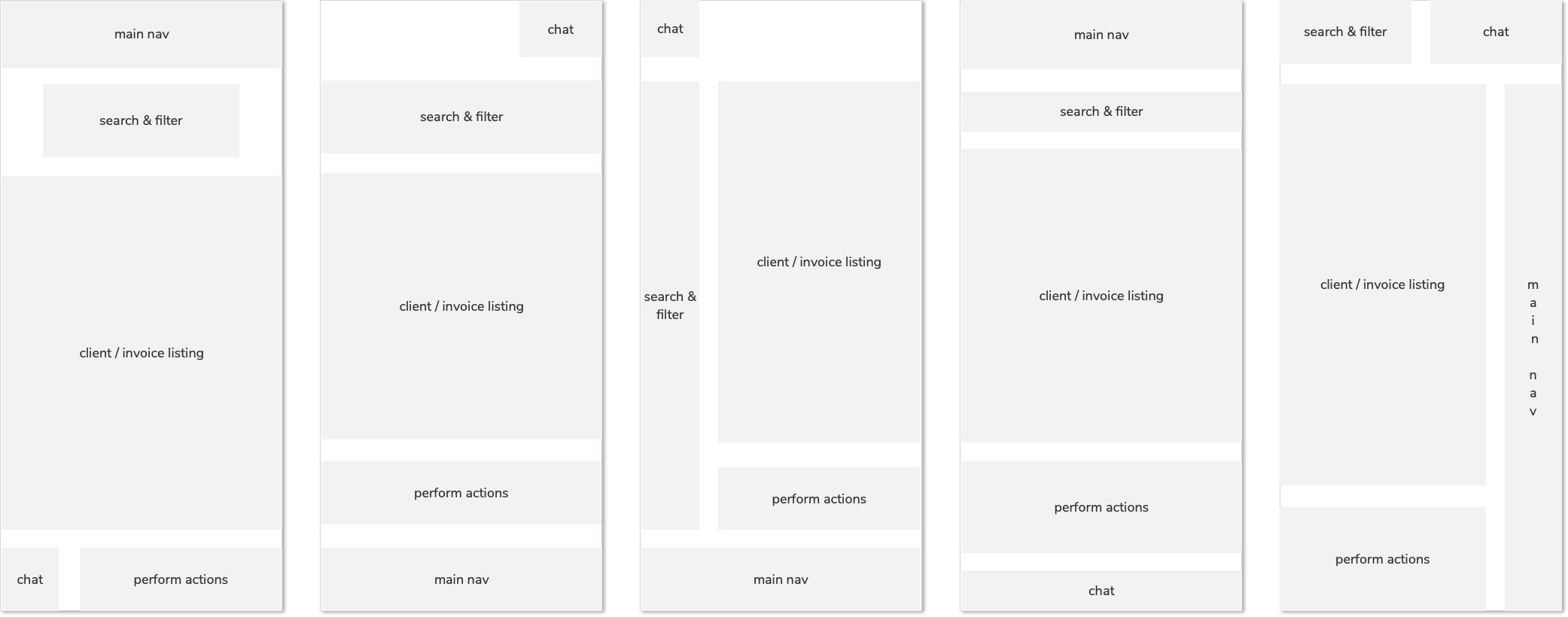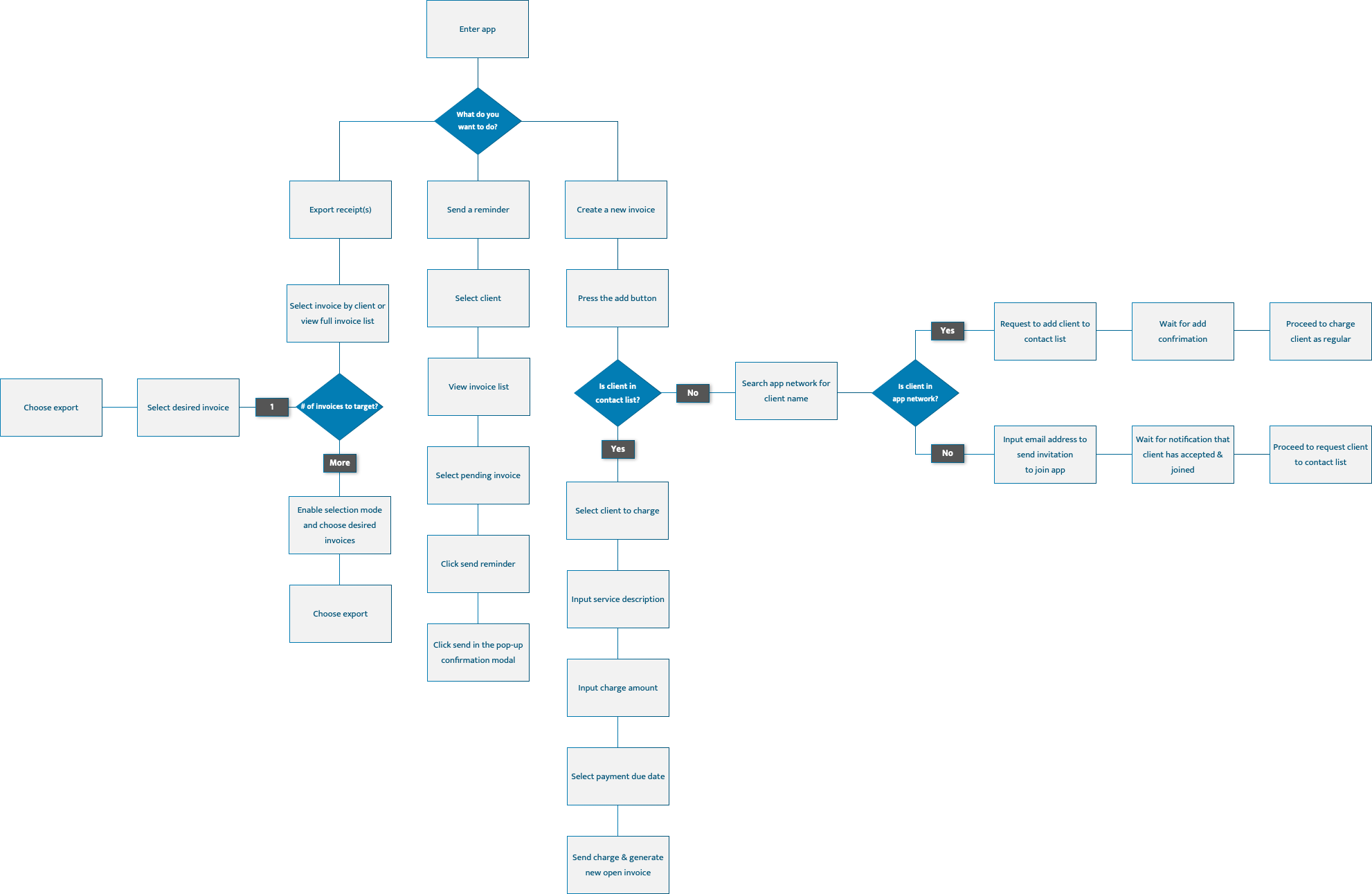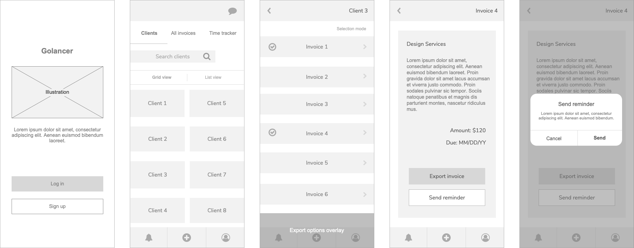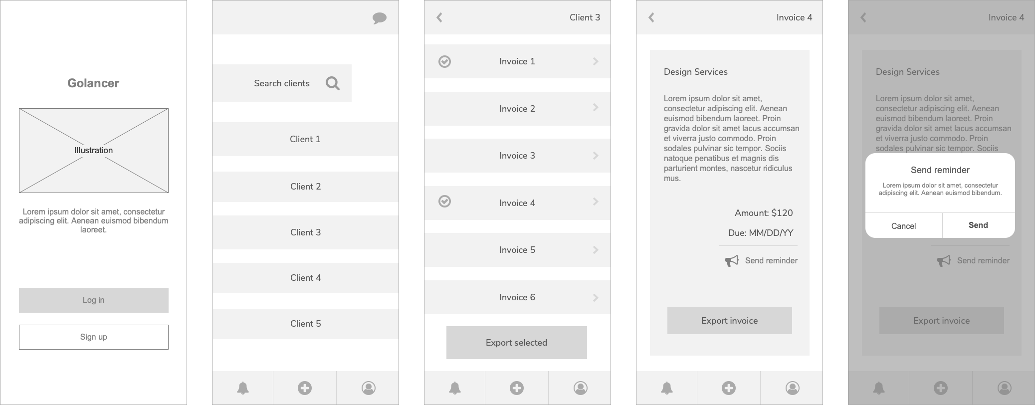 I selected the strongest layout from the group, and expanded upon it to create key wireframes. These flows represent use case scenarios exporting a selection of invoices or sending a reminder to a client.