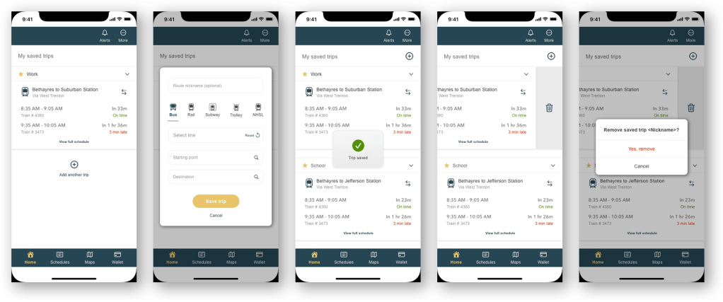 Paths are mapped out for three common use cases: Add or remove Saved Trip, View Schedule or Next to Arrive train, and Update Payment Method.