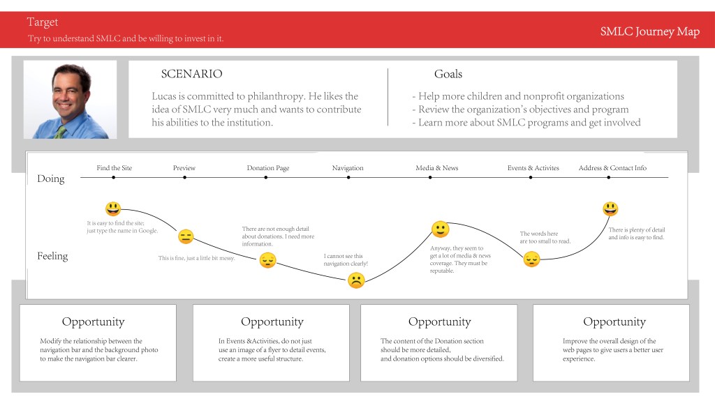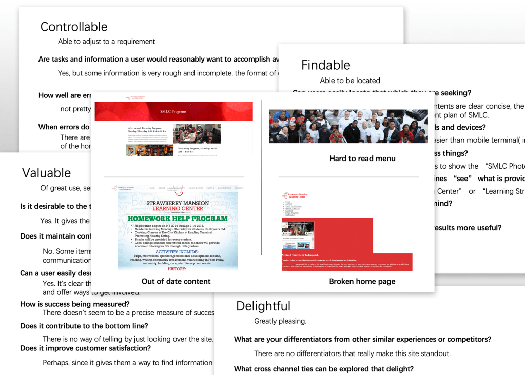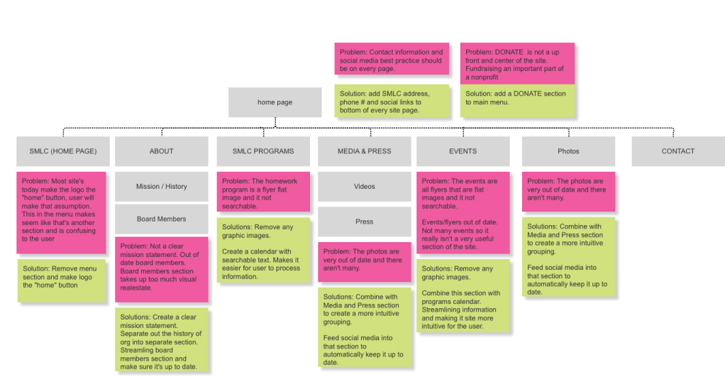 Working in a group of 3, my teammates and I began with an audit of the site’s current standing. We used Abby Covert’s Information Architecture Heuristics as a framework to conduct our audit, asking ourselves how the presentation of information on SMLC’s website measured up against the following criteria: